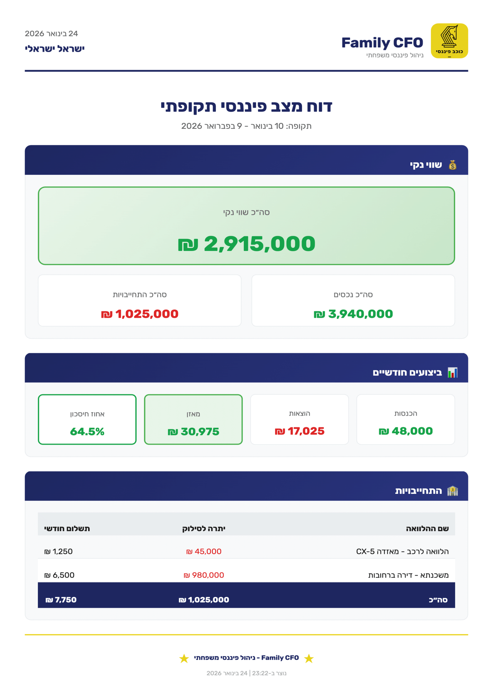 הכירו את מערכת ה-Family CFO: הכלי המתקדם ביותר בישראל לריכוז, ניתוח ושליטה מלאה בכל הנכסים, המשכנתאות והתזרים שלכם. הכל במקום אחד, בזמן אמת.